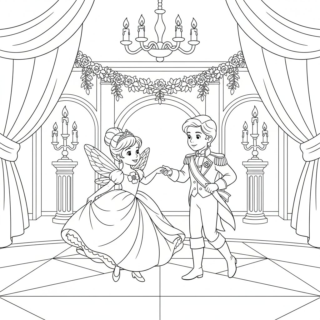 Página para colorear con nivel de detalle moderado que muestra a Pulgarcita bailando con gracia en un baile real. Gratis para descargar e imprimir.
