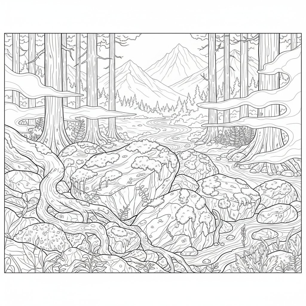 Página para Colorear de Rocas Musgosas Majestuosas - Difícil