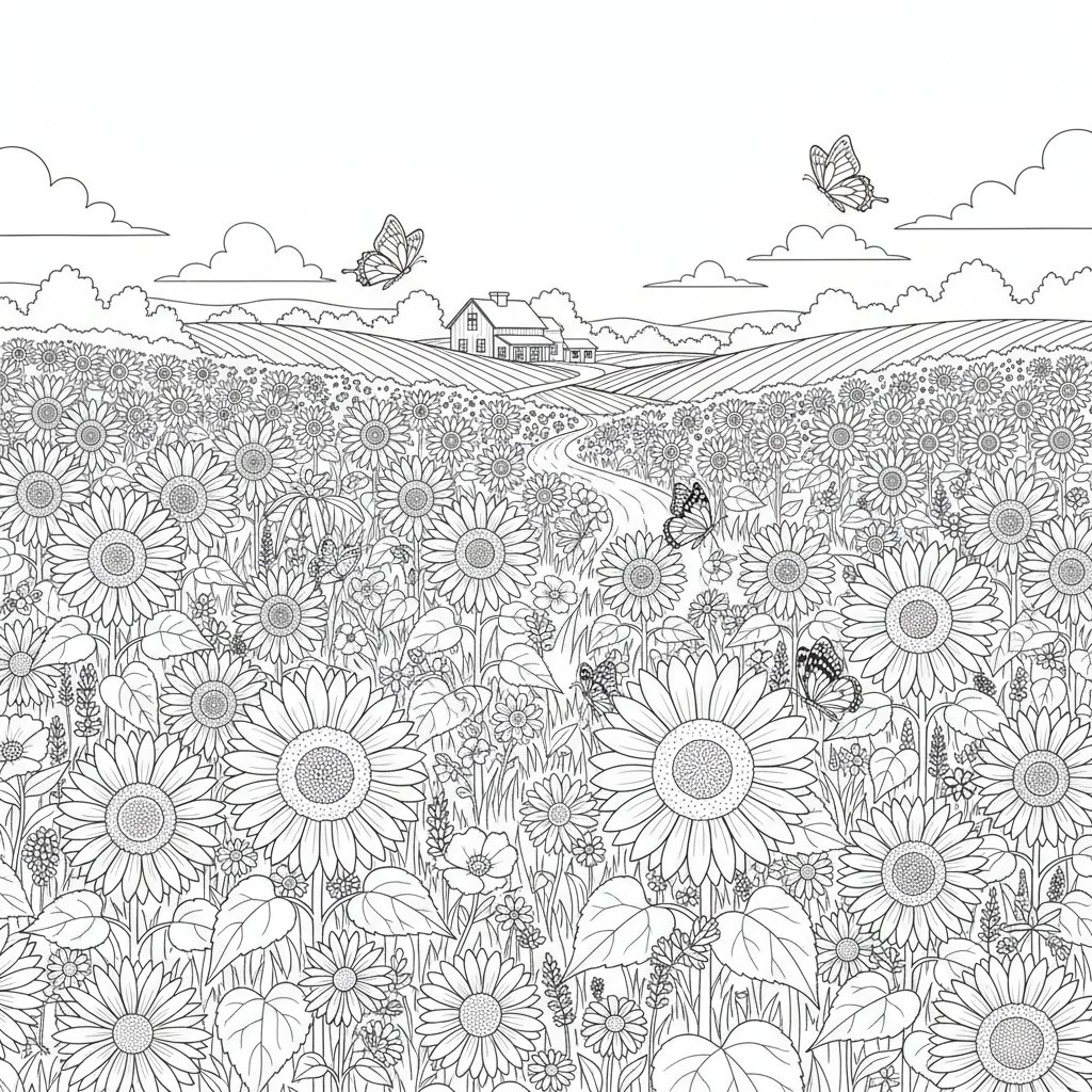 Página para Colorear de Campo de Girasoles - Difícil